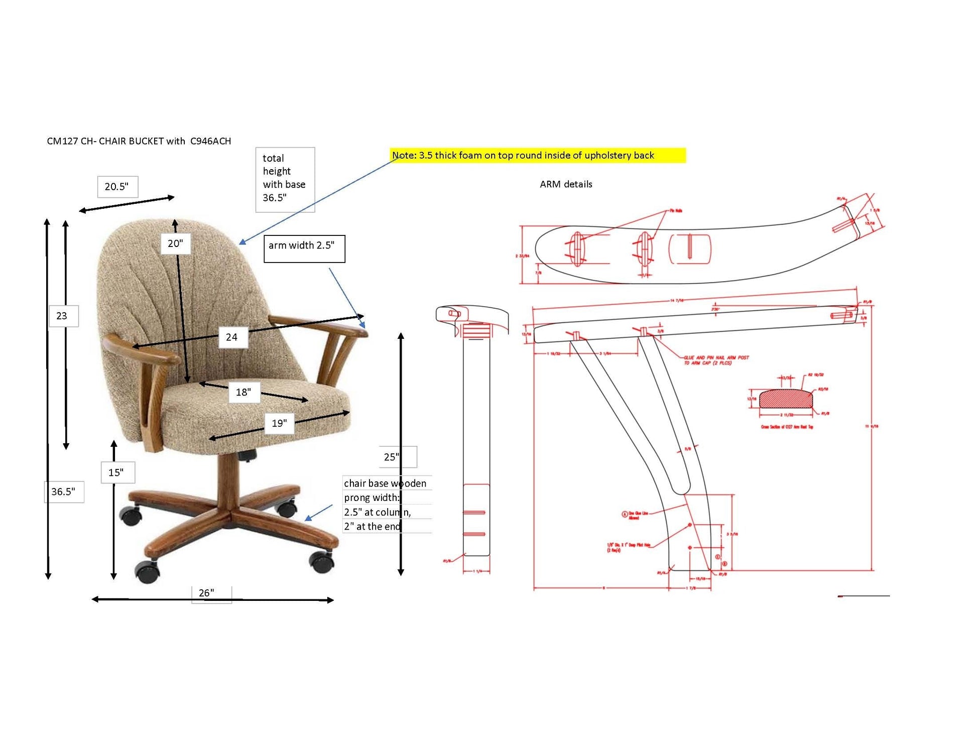 The Chromcraft C127946 swivel tilt caster arm chair is extremely comfortable and well made. The solid wood chair has an upholstered seat and back for extra comfort. The tension of the tilt on the chair can be adjusted and set to your preference. This chair is available in different fabrics or vinyl, and your choice of wood finish. You get to customize this chair to complement your home's decor. This will allow you to have a chair that will look like it was made for your kitchen. Chair is pictured in the walnut wood finish. Minor assembly required. 1 chair included. Chair # C127946.