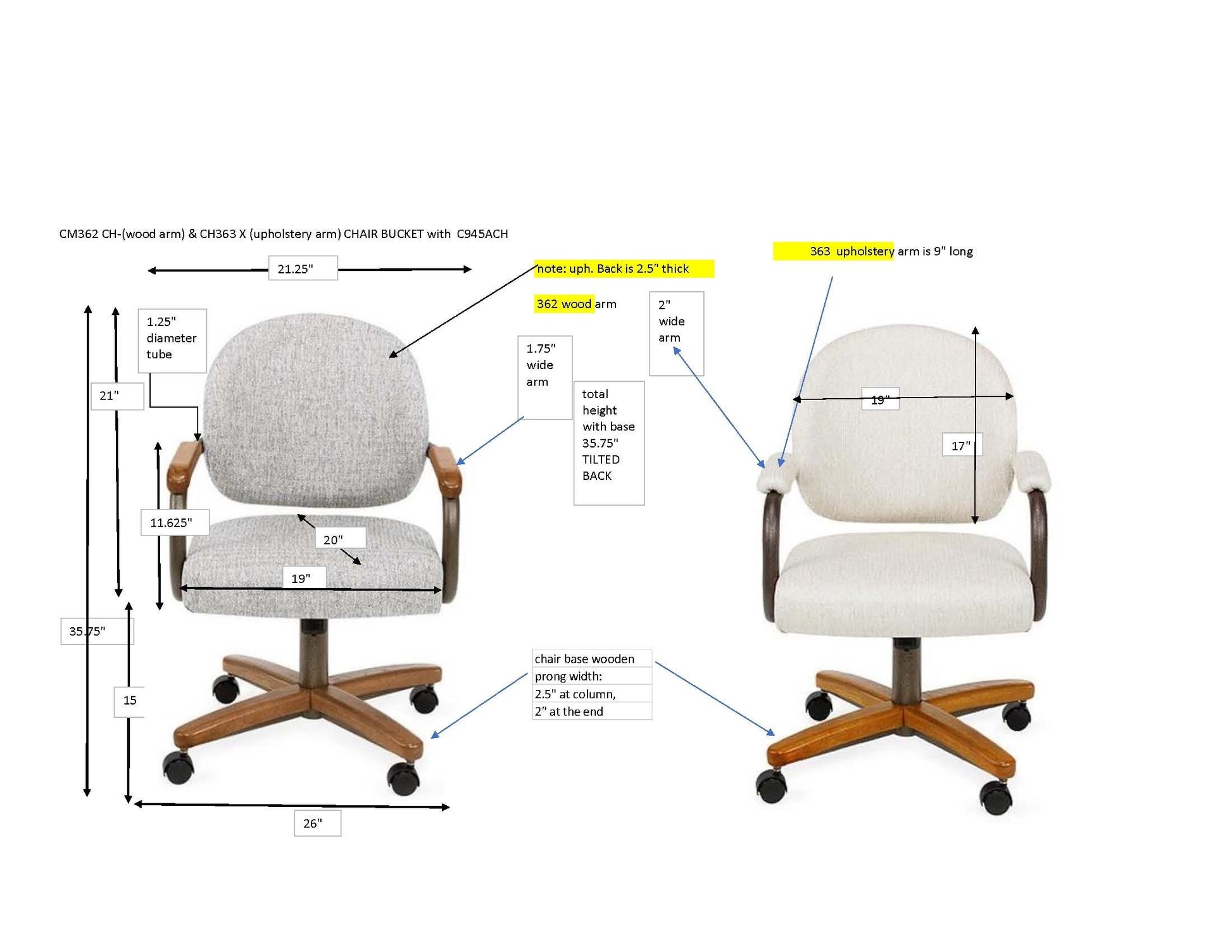 The Chromcraft C363945 metal swivel tilt caster arm chair is extremely comfortable and well made. The chair has an upholstered seat, back and arms for extra comfort. The tension of the tilt on the chair can be adjusted and set to your preference. This chair is available in different fabrics or vinyl. 1 chair included. Minor assembly required.