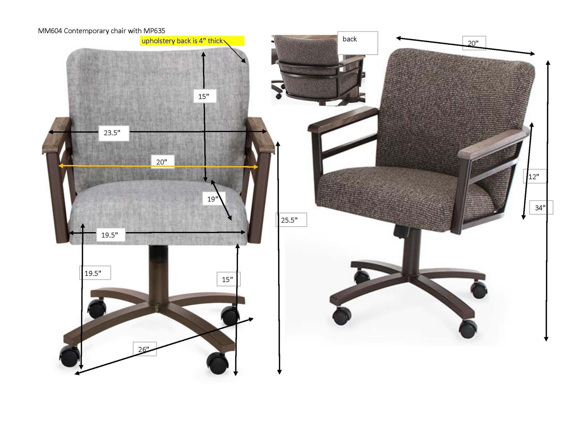 The Chromcraft Metalcraft O&S swivel tilt caster barrel back arm chair is comfortable and unique. The Aged Iron metal and smoke wood finish accents are absolutely gorgeous. The chair is available in different fabrics and vinyls. 1 chair included. Minor assembly required. Chair Model MM604OS-MP635O.
